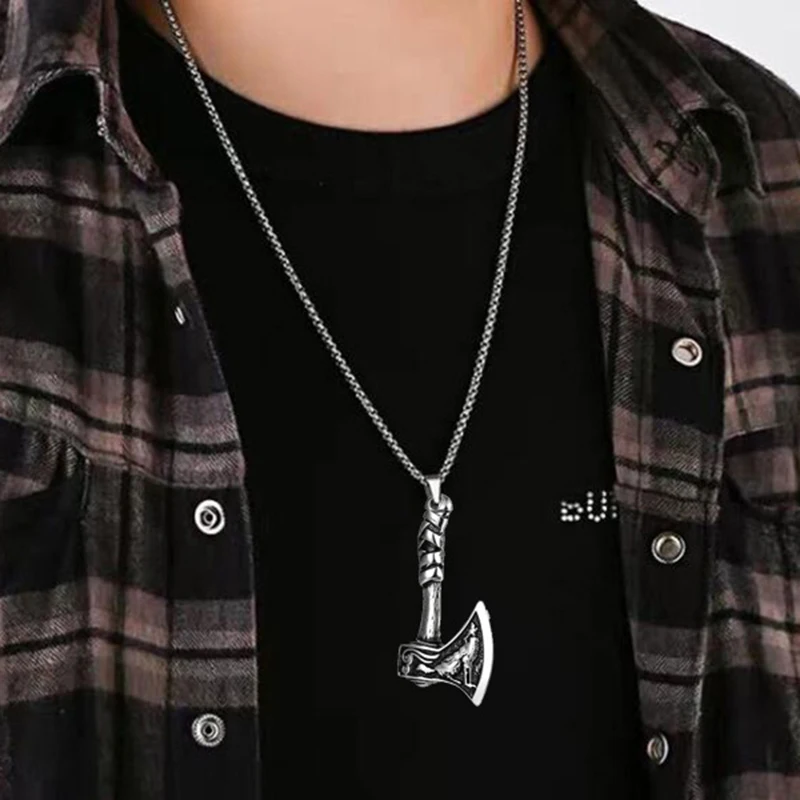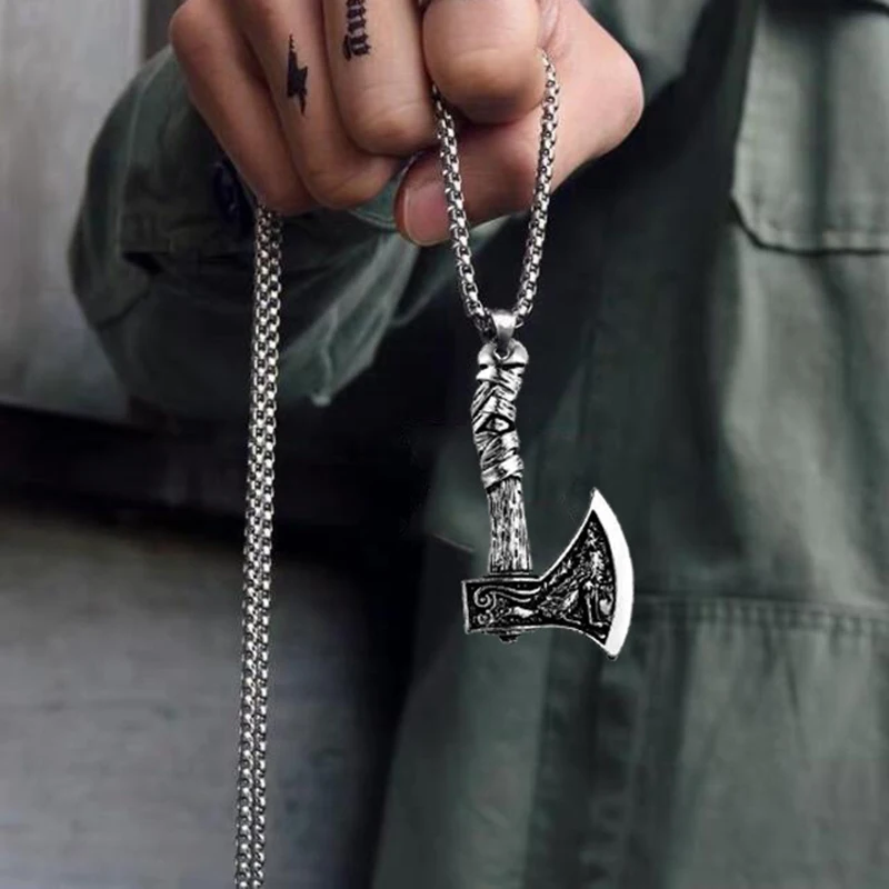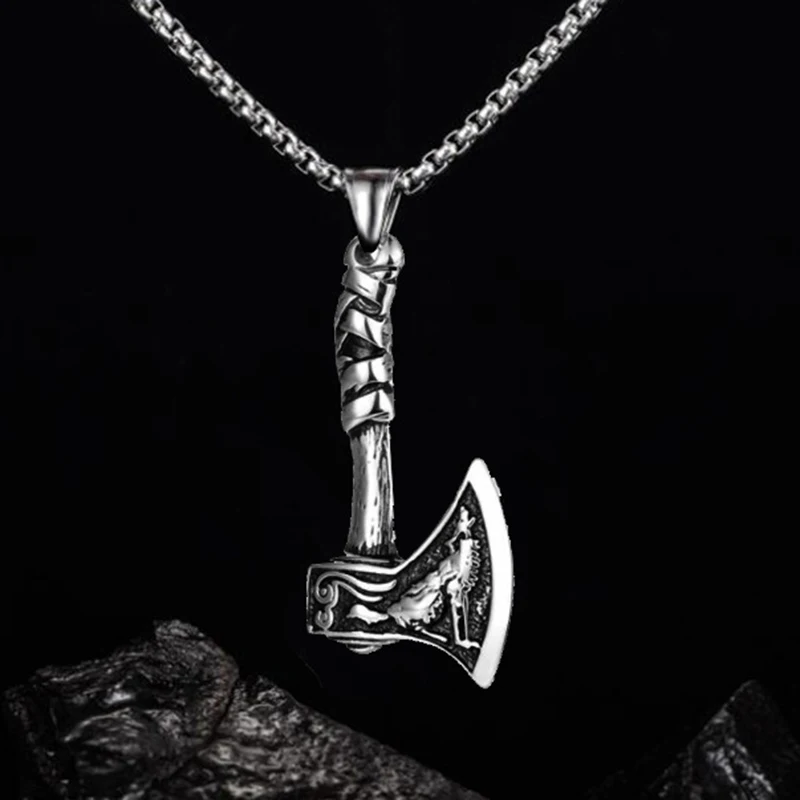 Punk Style men's Necklace With Viking Axe Pendant Silver Color Vintage Wolf Pattern Hip Hop Rock Jewelry Neck Accessories Gifts