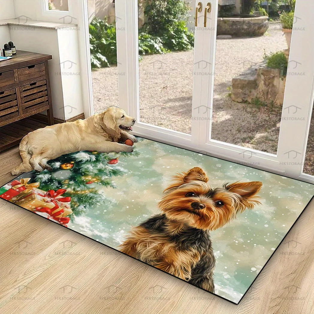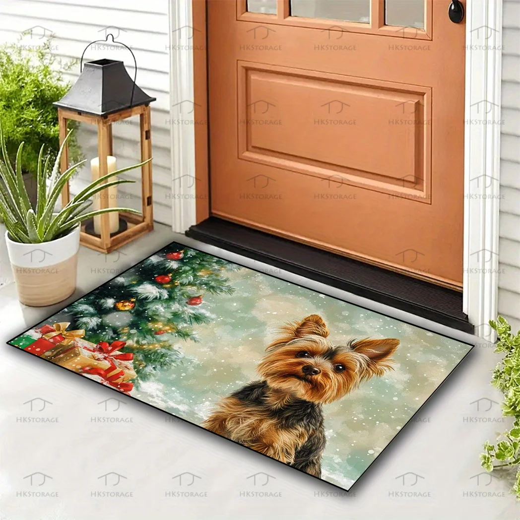 Christmas Season Yorkshire Pet Print Entryway Floor Mat Anti Slip Waterproof Decorative Rug Holiday Decoration